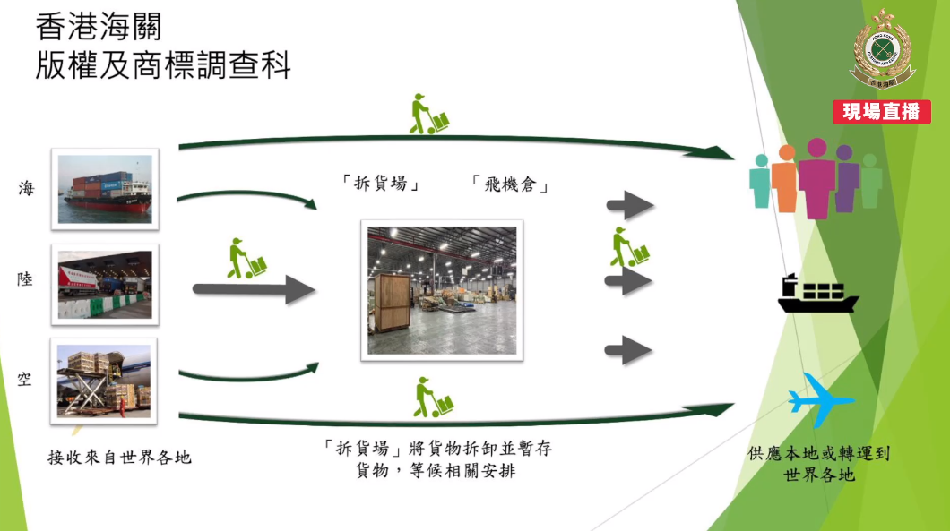 海關日前鎖定3艘由南沙抵港的船隻,選取7個報稱載有生活用品的貨櫃查驗,發現大批冒牌物品,佔每個貨櫃貨量只有1%至15%,形容查驗難度極高。海關指,大部分冒牌物品為獨立包裝,造工不算太粗疏,有些甚至有「出世紙」。海關估計,大部分貨物會經香港運往馬來西亞、印尼、阿聯酋、荷蘭和伊拉克。