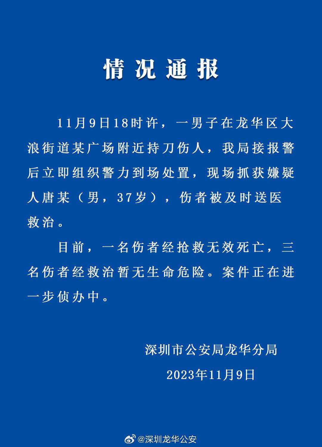 【點新聞報道】據深圳龍華公安通報,11月9日18時許,一男子在龍華區大浪街道某廣場附近持刀傷人,深圳市公安局龍華分局接到報警後立即組織警力到場處置,現場抓獲嫌疑人唐某(男,37歲),傷者被及時送醫救治。