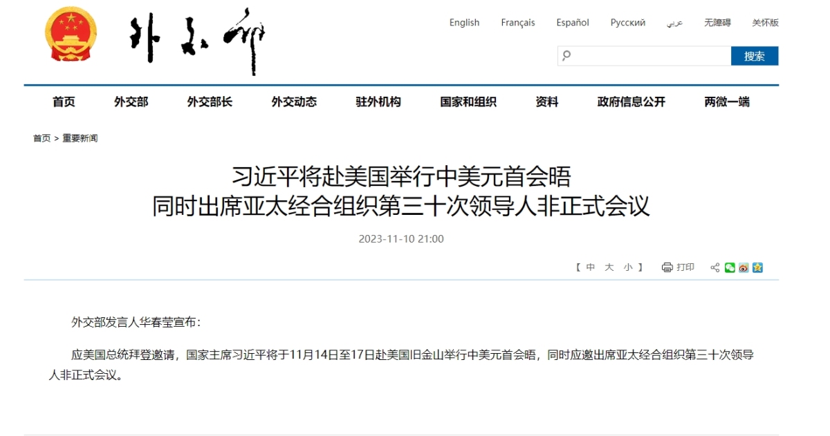 外交部發言人華春瑩宣布:應美國總統拜登邀請,國家主席習近平將於11月14日至17日赴美國舊金山舉行中美元首會晤,同時應邀出席亞太經合組織第三十次領導人非正式會議。