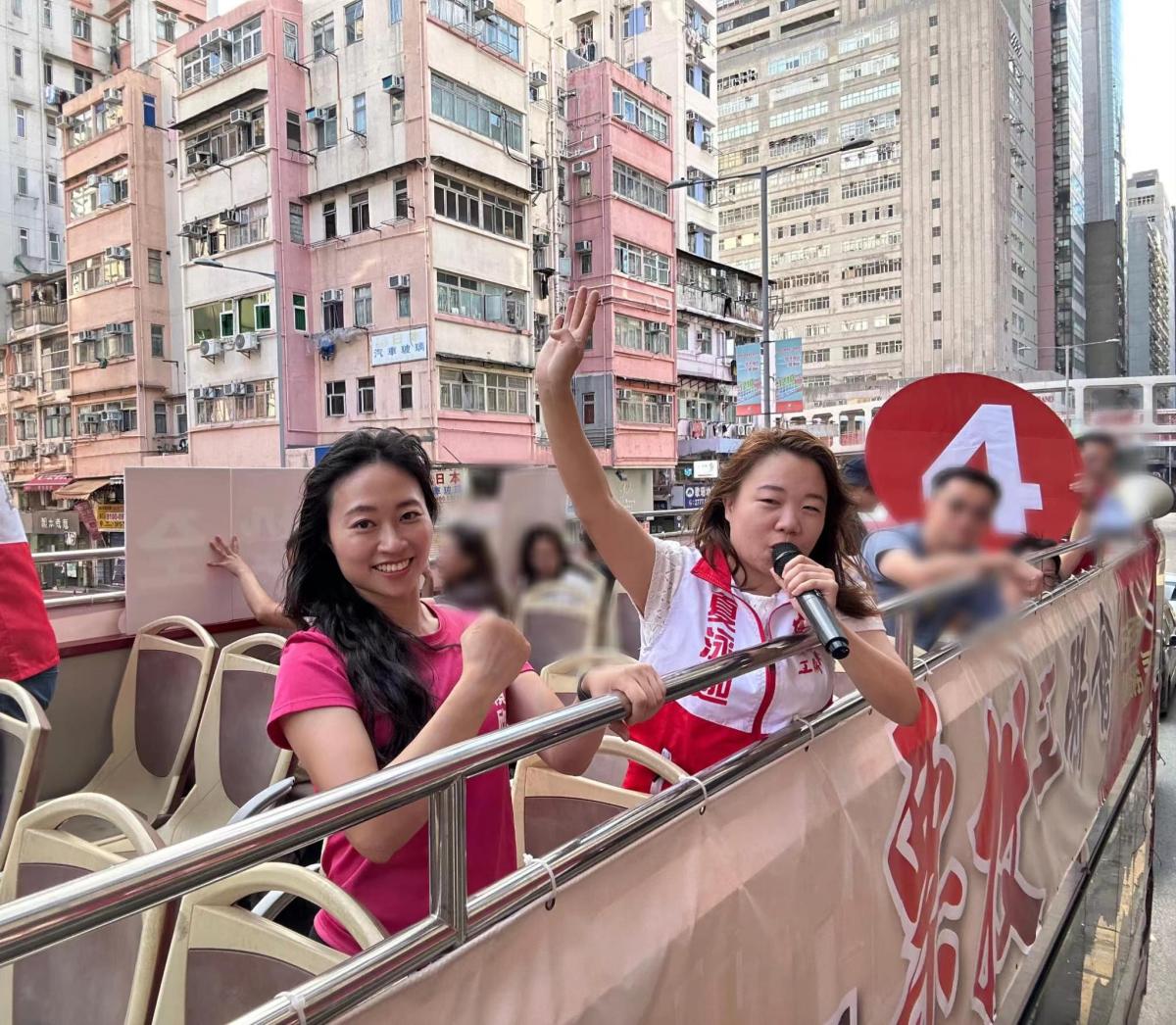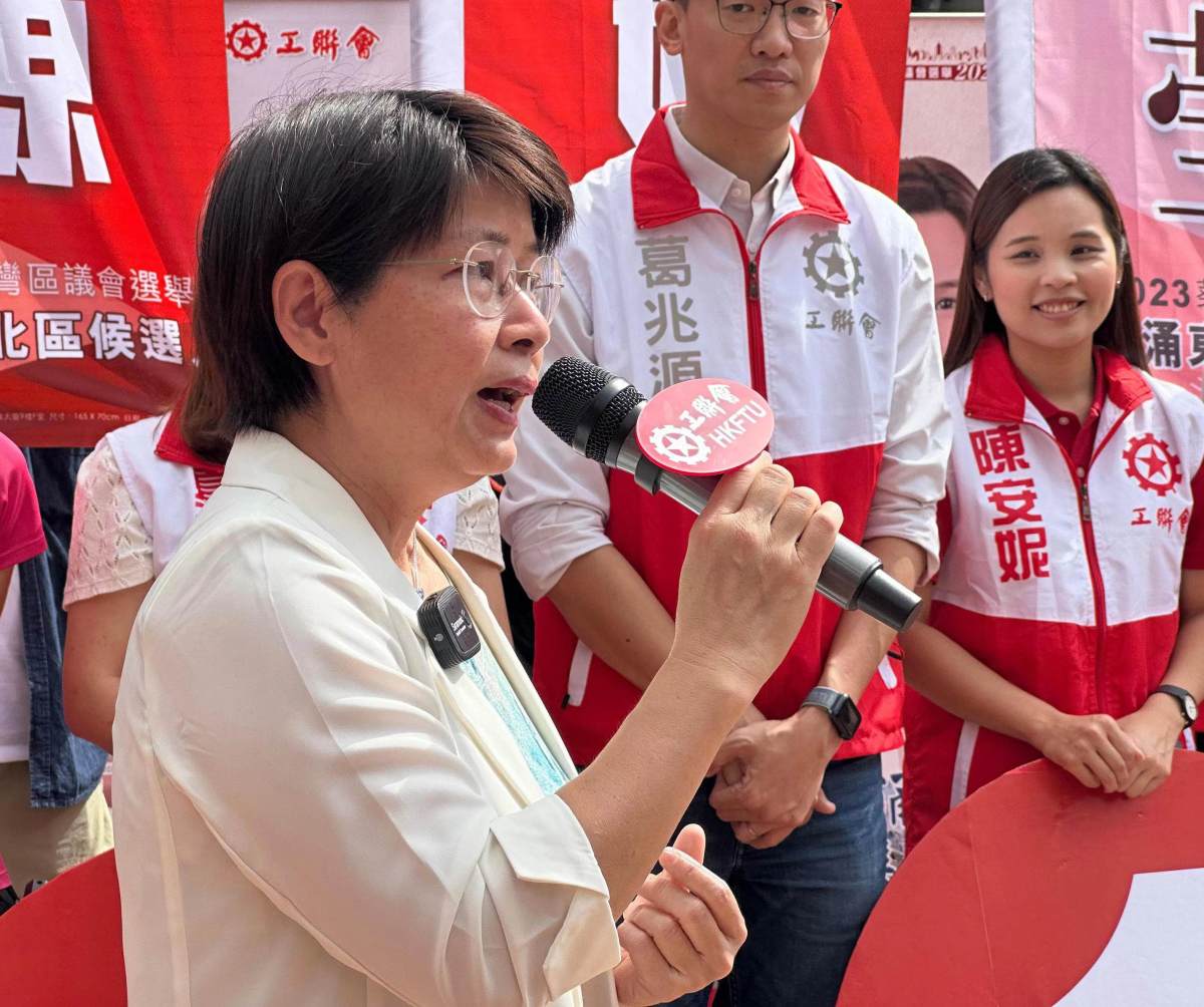 專欄作家屈穎妍到場支持工聯會候選人,她表示工聯會是年資最長的工會,服務市民最貼地的工會,期望年青人可承傳工聯會精神,不單是參政這麼簡單,更是服務大眾、貢獻社會的機會。