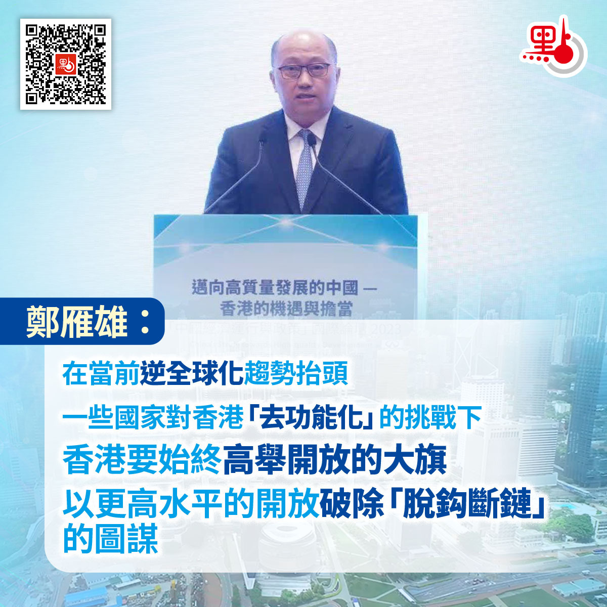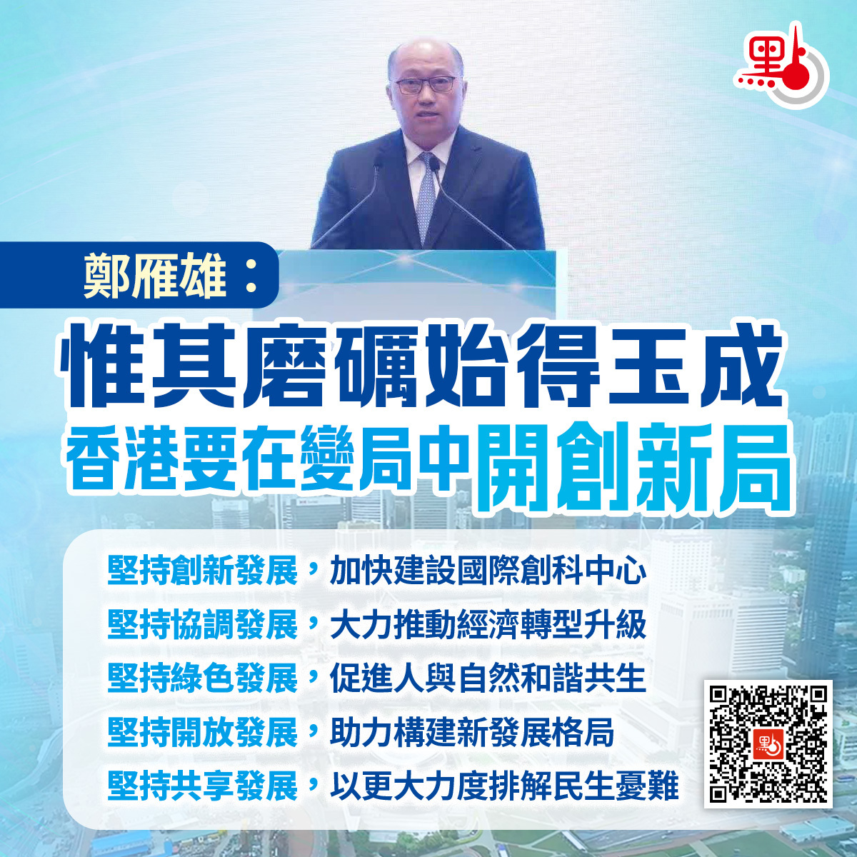鄭雁雄指出,當前,「兩個大局」交相演進、風雲激蕩,中國式現代化萬馬奔騰、一往無前。世界有變數、香港就有「着數」,中國有偉局、香港就有新局。理念是行動的先導,香港要在變數之中實現「着數」、在變局之中開創新局,很大程度取決於勇於思變、應變、求變,取決於自身發展理念的更新,取決於能否以高質量發展駕馭世界變數實現香港「着數」,推動由治及興。