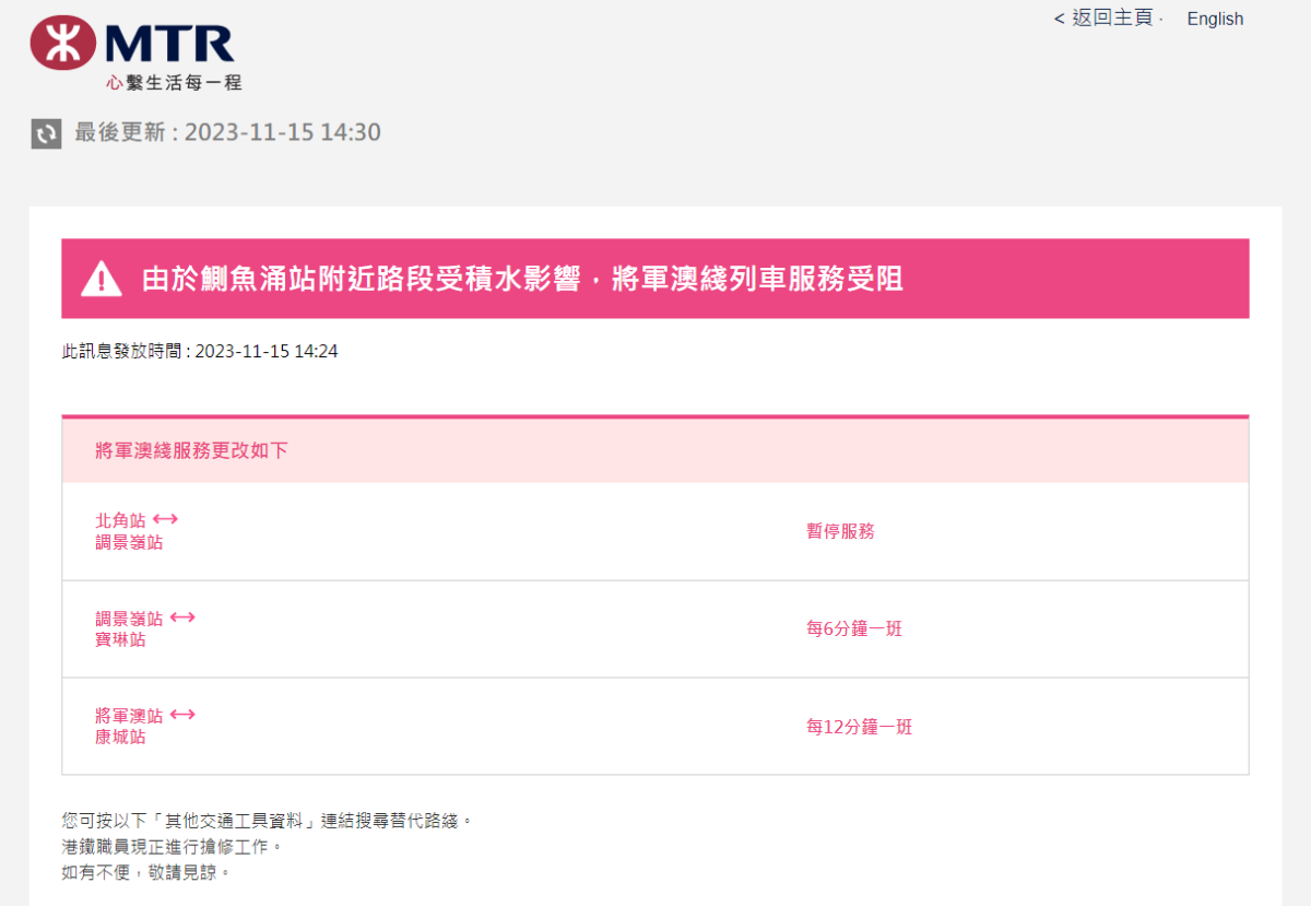【點新聞報道】港鐵今日(15日)表示,由於將軍澳綫鰂魚涌站附近路段受積水影響,現時將軍澳綫來往北角站至調景嶺站列車服務暫停。