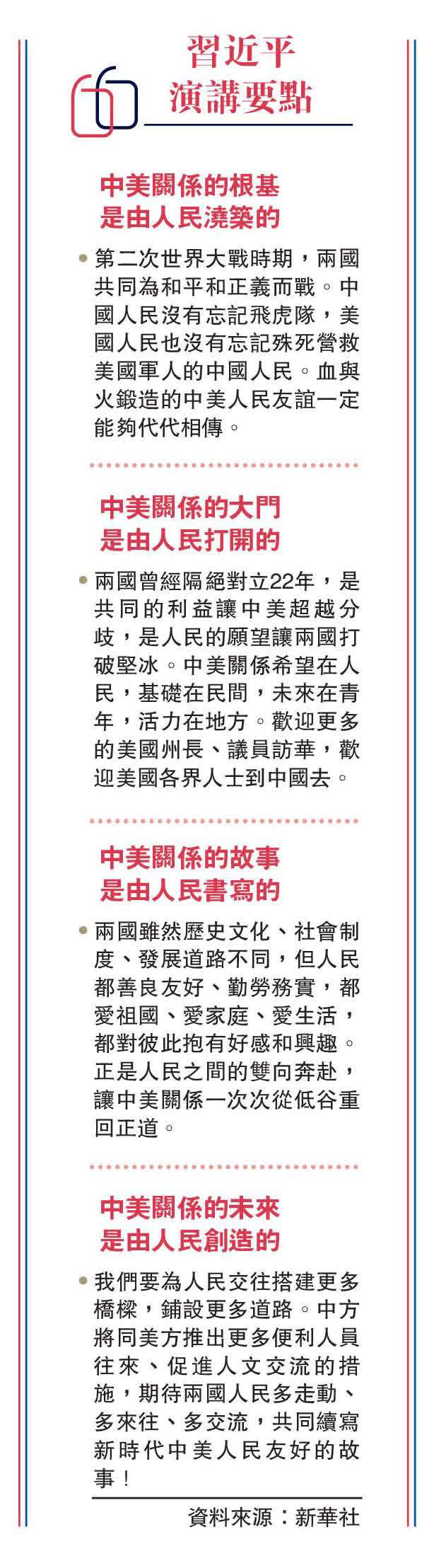 習近平指出,歷史長河大浪淘沙,最終沉澱下來的總是最有價值的東西。不論形勢如何變化,中美和平共處的歷史邏輯不會變,中美人民交流合作的根本願望不會變,世界人民對中美關係穩定發展的普遍期待不會變。任何一項偉大事業要成功都必須從人民中找到根基、從人民中集聚力量、由人民來共同完成。中美友好就是這樣一項偉大事業。讓我們匯聚起兩國人民的力量,賡續中美友誼,推進中美關係,為促進世界的和平和發展作出更大貢獻!