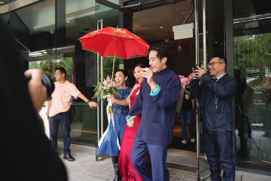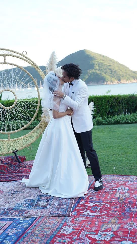 從照片所見,一對新人婚禮在一個海邊場地舉行,Candace身穿白色婚紗,二人甜蜜擁吻。其中一張是Alex拖着穿上紅色長裙的新娘子,身旁有人撐傘,相信是傳統的接新娘儀式。據知二人是奉子成婚,照片中Candace疑似腹部微隆,以手遮擋,再惹揣測。