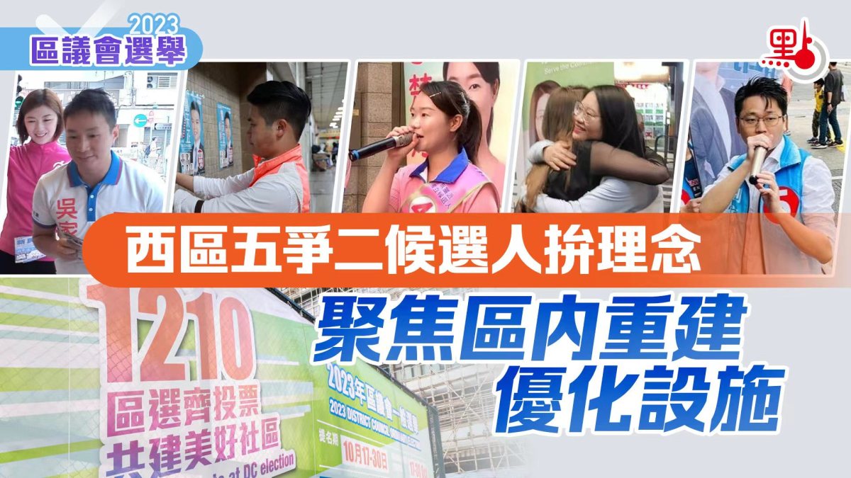 【點新聞報道】12月10日是完善地區治理後的首場區議會選舉。西區作為中西區轄下選區,將會產生2個地方直選議席。今次選舉共有5名候選人,包括1號吳家超(新民黨),2號劉天正(民建聯),3號王倩雯(無申報政治聯繫),4號李楚婷(無申報政治聯繫),5號劉家昂(獨立),競爭激烈。