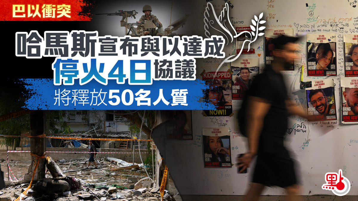 據央視新聞報道,巴勒斯坦伊斯蘭抵抗運動(哈馬斯)當地時間22日發表聲明,宣布其在卡塔爾與埃及的斡旋下,與以色列達成為期4天的人道主義臨時停火協議。哈馬斯將釋放50名被其扣押的以色列婦女和兒童,以色列將釋放被其拘捕入獄的150名巴勒斯坦婦女和兒童。