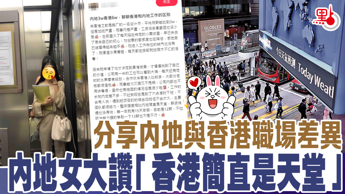 近日有一位透過優才計劃從內地來港工作的女設計師,在小紅書上分享中港職場文化的分別,表示來港後才慢慢找到自己的價值,認為相比起來香港「簡直是天堂」,直言「在香港的生活狀態是遠遠大於內地的,不管是為了賺錢還是以後的發展,我暫時還是會在香港」。