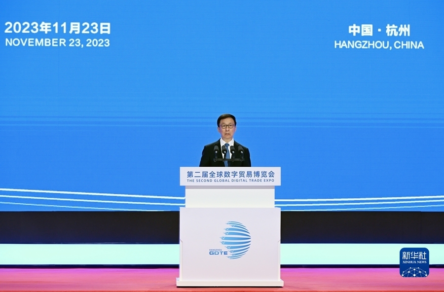 據新華社報道,國家副主席韓正23日在浙江杭州出席第二屆全球數字貿易博覽會開幕式,宣讀習近平主席賀信並致辭。