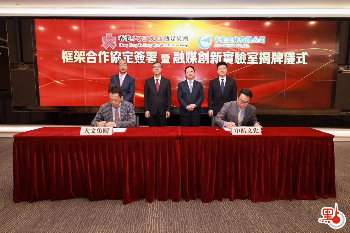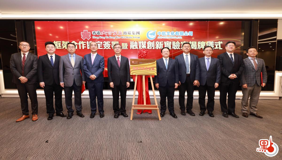 【點新聞報道】11月27日,香港大公文匯傳媒集團與中航文化有限公司簽署框架合作協議並舉行融媒創新實驗室揭牌儀式。香港大公文匯傳媒集團董事長、總編輯李大宏,中航文化有限公司董事長蔡二雨等出席簽約儀式並為融媒創新實驗室揭牌。雙方本着平等互利、優勢互補的原則,結成長期、全面合作夥伴關係,實現資源共享、優勢互補、共同發展。