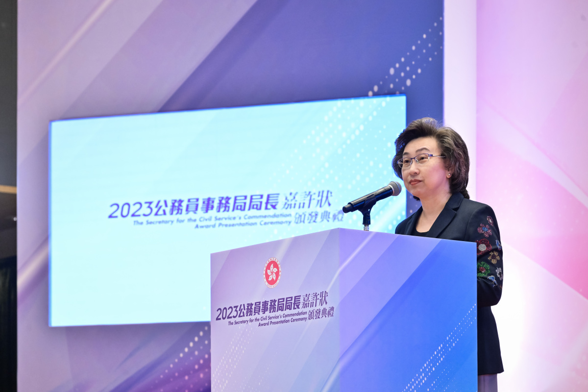 楊何蓓茵在典禮上表示,獲嘉許的同事在各自的工作崗位及服務範疇展現工作熱誠,他們對提供優質公共服務的堅持,以及追求卓越的精神,都非常值得學習。她指出,公務員隊伍是政府管治團隊的骨幹,是施政的關鍵。《行政長官2023年施政報告》提及多項措施以強化公務員管理制度,包括推進獎罰分明制度,表揚工作表現出色和盡忠職守的公務員。此外,政府會繼續加強全體公務員的培訓,提升愛國精神和國安意識,以及推行大灣區公務員交流計劃,讓香港公務員有機會較長時間暫駐內地交流,較深度體驗大灣區內地城市的發展。她勉勵所有公務員繼續秉承優質服務的精神,以民為本,凡事多走一步,精益求精,向公眾展現更多的公務員好故事。