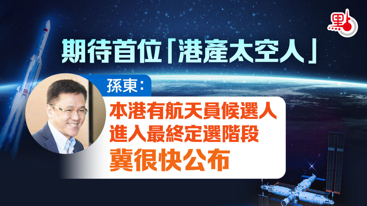 【點新聞報道】國家去年宣布展開第四批預備航天員的選拔工作,並且首次在香港選拔載荷專家,本港期待會有首位「港產太空人」誕生。創新科技及工業局局長孫東表示,很高興香港有航天員候選人已經進入最終的定選階段。全港市民都希望香港的候選人有機會實現航天夢,貢獻國家。相信這是全香港市民都期待的結果,希望很快會有好消息公布。