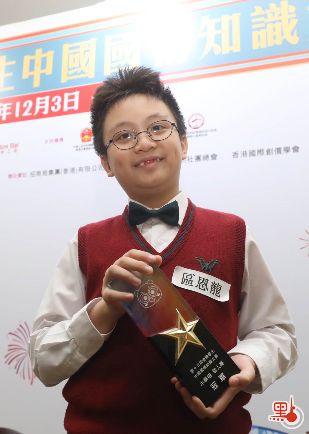 小學組個人賽冠軍由英華小學小五學生區恩龍獲得,「我本身都好想增長一下對國情的認識,所以好榮幸能夠參加今次比賽,更高興能夠獲得冠軍。」恩龍分享說,是次比賽題庫足足有126版,每版平均約有6題,因此事前花了大約3個月時間作準備,笑言「問題數量好多,但我本身記性都不錯!」