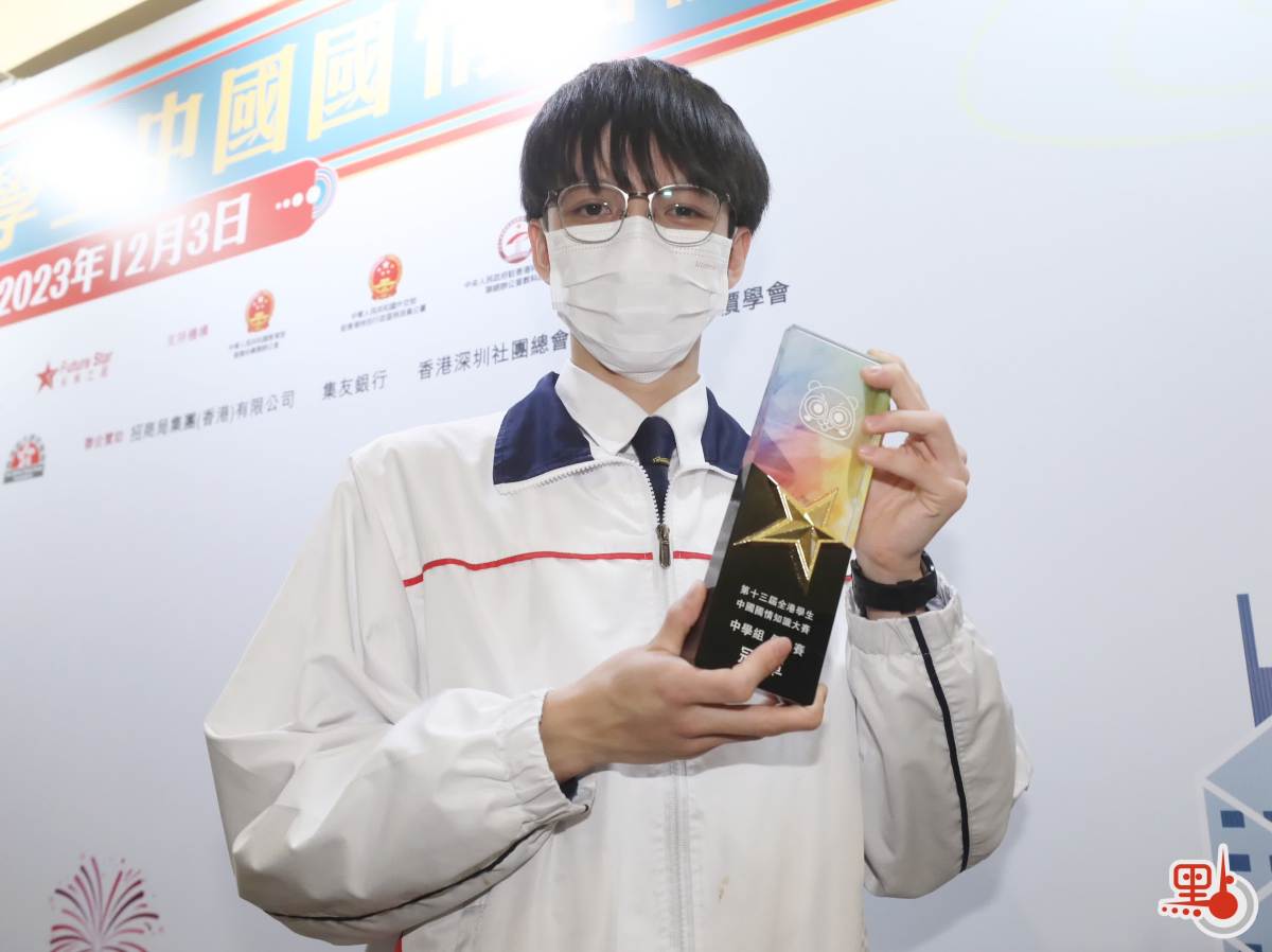 【點新聞報道】為搭建全港青少年學習中國歷史文化、了解祖國建設進程的平台,特區政府教育局、香港大公文匯傳媒集團和未來之星同學會聯合主辦「第十三屆全港學生中國國情知識大賽」,決賽及頒獎典禮今日(3日)在香港會議展覽中心舉行。今屆國情知識大賽中學個人組冠軍由保良局董玉娣中學中五學生黃泓智獲得,「我其實讀理科為主,但本身對於國家歷史都很感興趣,於是希望透過參賽,增長一下國家歷史文化的知識。」泓智在頒獎禮後與大公文匯全媒體記者分享自己閒時會利用課餘時間讀中史,「包括一些歷史課外書,又或是歷史漫畫等等,用比較有趣味的方式增進自己對歷史的認知……當中尤其對隋唐時期感興趣,因為那是個相當繁榮昌盛的時代。」