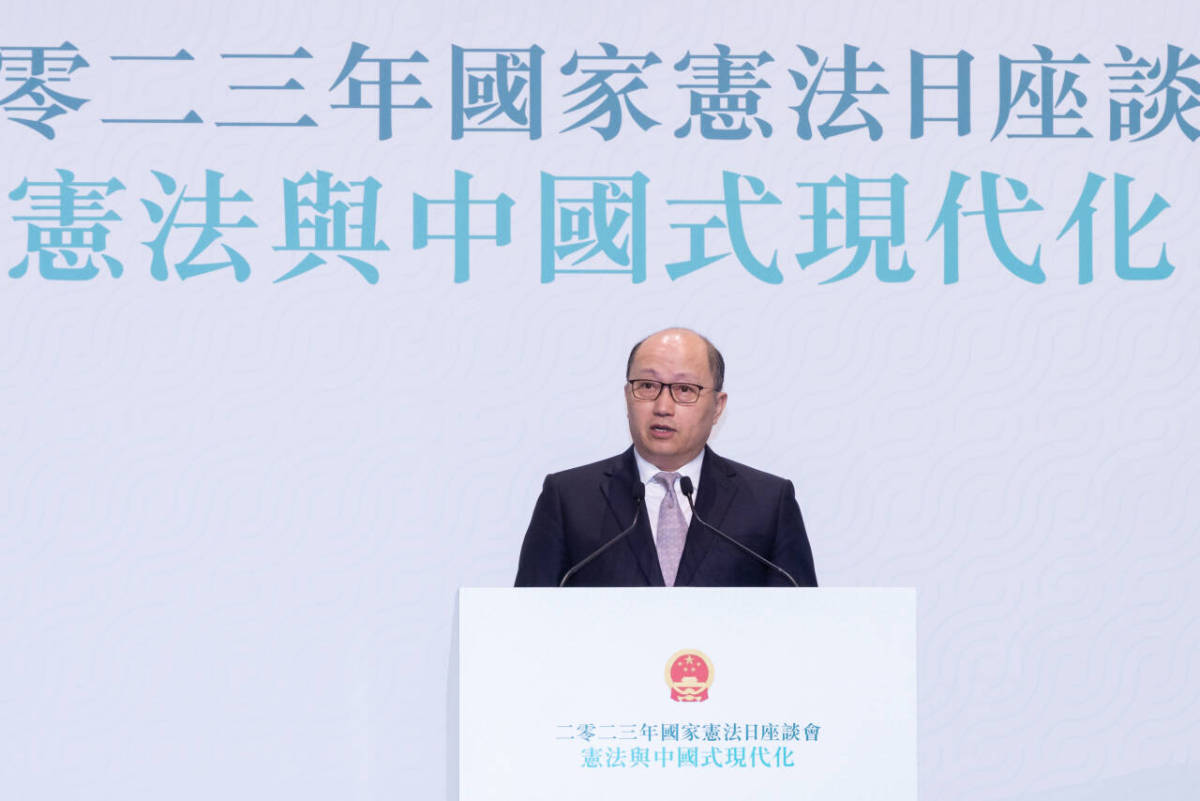 鄭雁雄分享了三點看法,一是憲法為以中國式現代化全面推進中華民族偉大復興提供了根本法律依據、根本法治保障,二是憲法引領保證香港參與國家現代化建設、保持長期繁榮穩定,三是在中國式現代化新征程中主動擔當作為是香港必須履行的憲制責任。鄭雁雄的致辭全文如下:
