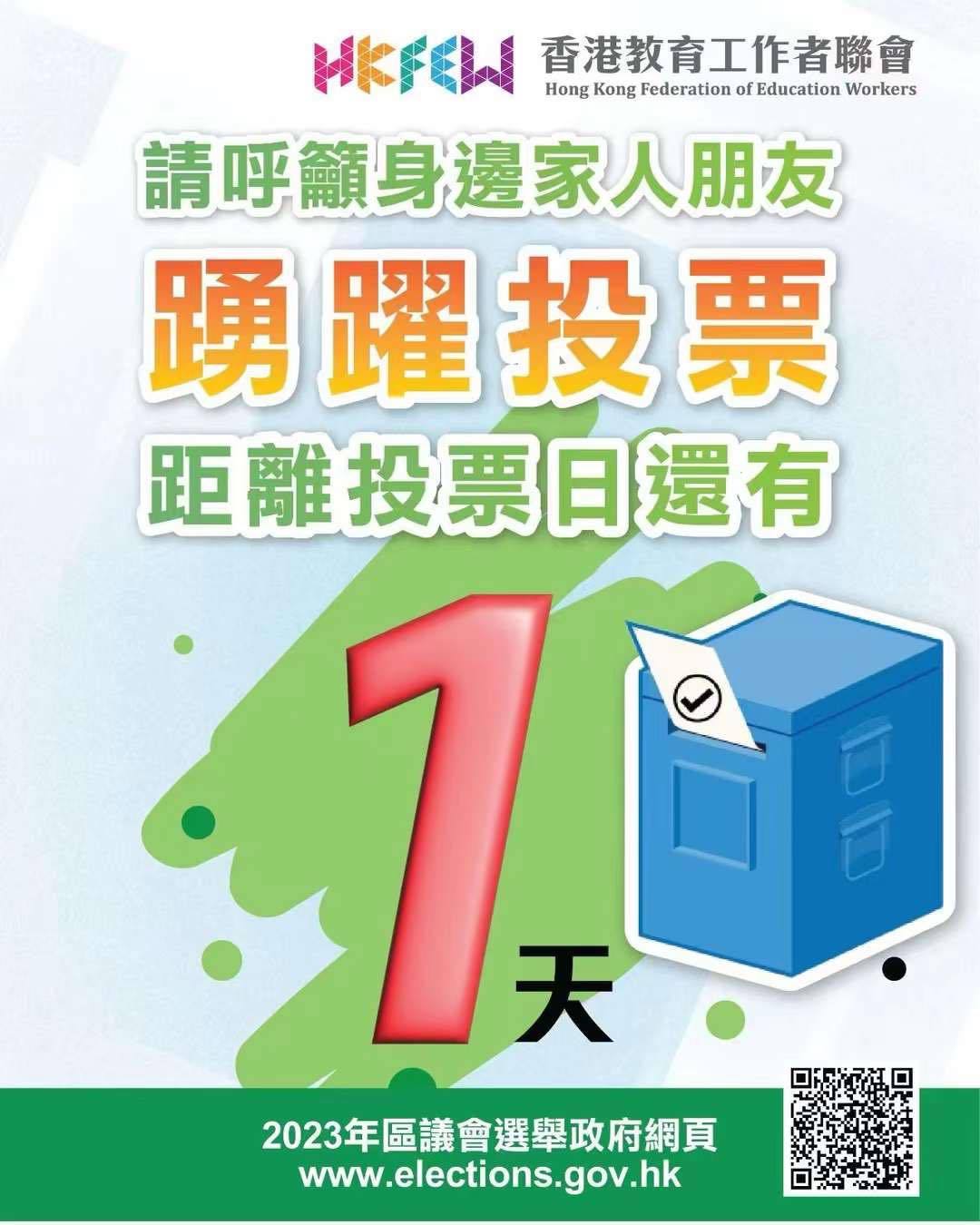 香港教育工作者聯會今日於社交媒體發文呼籲市民把握時間,一齊參與1210區議會一般選舉,呼籲市民踴躍投票,爭取時間投選理想人選,共建美好社區。