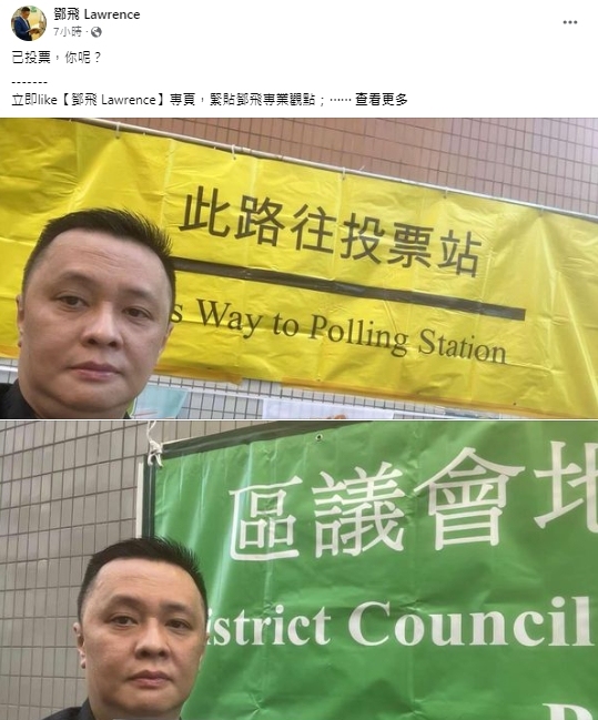 教聯會副會長、立法會議員鄧飛今日前往上水港鐵站附近設立的鄰近邊境投票站,呼籲大家投票,並發出自己「已投票」的帖文。鄧飛連續發出多條帖文,支持自己心儀的候選人參選。
