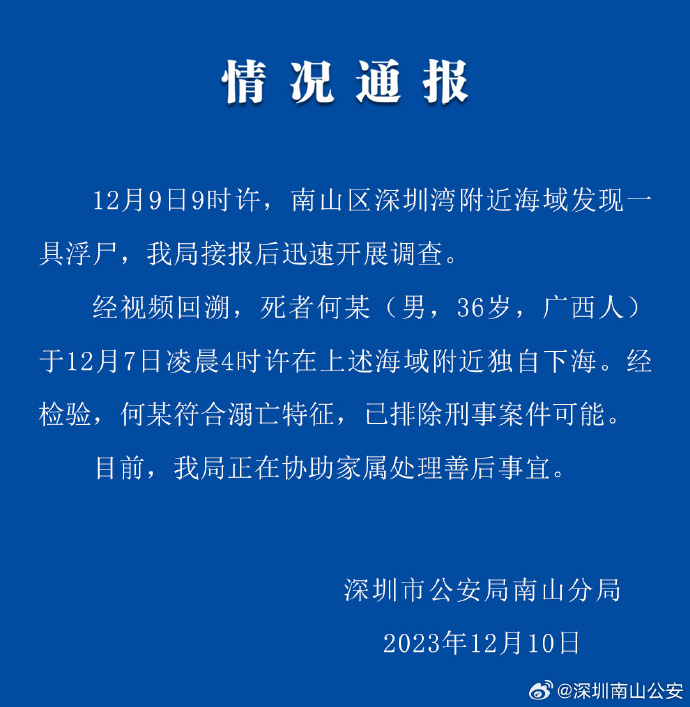 通報稱,12月9日9時許,南山區深圳灣附近海域發現一具浮屍,深圳市公安局南山分局接報後迅速開展調查。經視頻回溯,死者何某(男,36歲,廣西人)於12月7日凌晨4時許在上述海域附近獨自下海。經檢驗,何某符合溺亡特徵,已排除刑事案件可能。