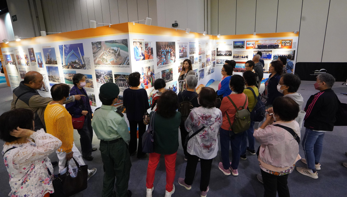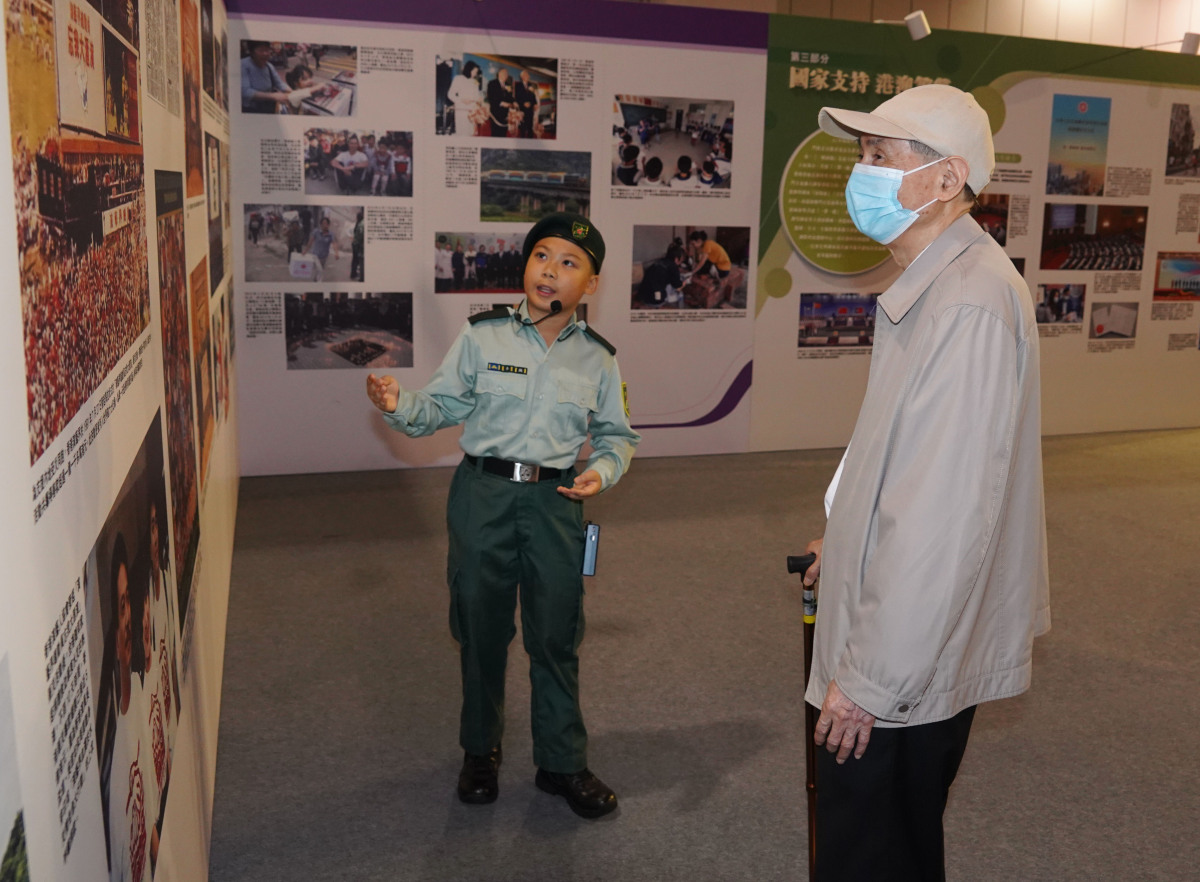 李伯伯今日路過會展,被今次展覽主題吸引而來。在瀏覽展板的過程中,有來自香港青少年軍總會的小導賞員為李伯伯講解國家改革開放、「一帶一路」倡議十周年取得的成就。當小導賞員談到國家航天最新發展,即讓李伯伯想起,前段時間有國家「航天團」來香港交流;小導賞員講述香港在1997年回歸祖國懷抱,李伯伯笑言「圖片中的儀式舉辦地,就是在這裏,在會展」。一長一幼的對話十分和諧,孩子稚嫩的聲音與長者自身親歷的記憶交錯,編織成對國家開放成就感動傳承的畫面。