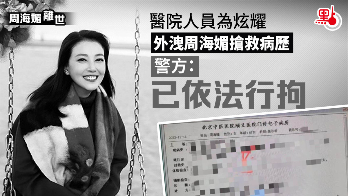 【點新聞報道】12月12日,周海媚工作室對外發布訃告,宣布周海媚因病醫治無效,於2023年12月11日去世,享年57歲。當晚,疑似周海媚生前送醫院搶救的電子病歷截圖在網上被流傳,病歷上顯示醫院為北京順義區某醫院,並記載了周海媚個人資料、就診時間等相關信息。