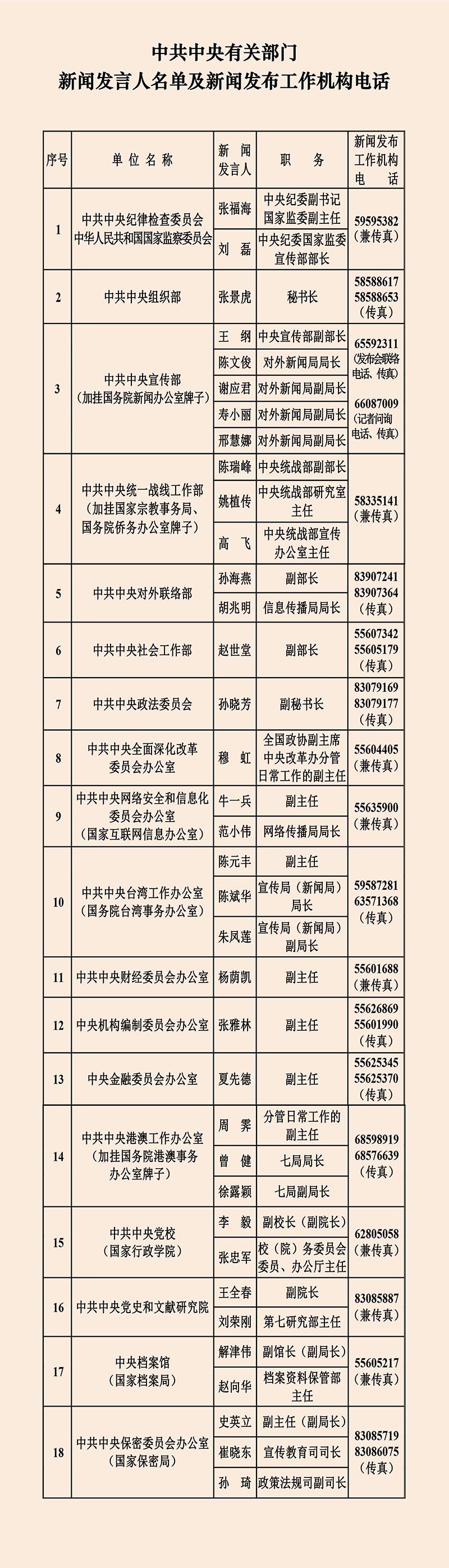 在「中共中央有關部門」新聞發言人名單中,中共中央社會工作部新聞發言人由副部長趙世堂擔任,中央金融委員會辦公室發言人是副主任夏先德。在「國務院有關部門」新聞發言人名單中,新成立的國家金融監督管理總局共有4名新聞發言人,分別是向東、李明肖、綦相、劉志清。