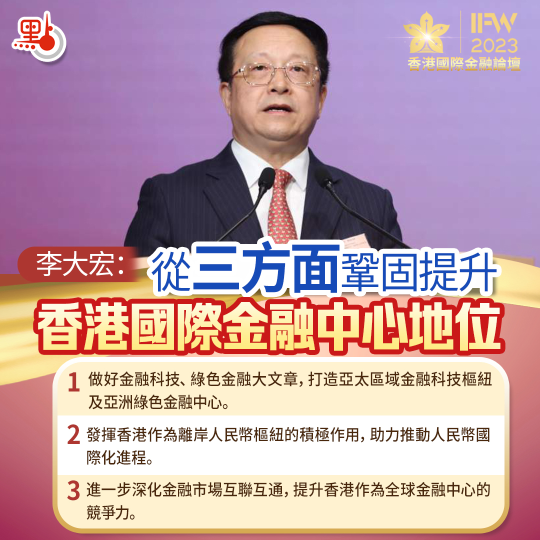 【點新聞報道】2023第十三屆香港國際金融論壇、香港國際ESG榜單年度評選頒獎典禮暨中國證券「金紫荊獎」頒獎典禮今日(15日)在香港舉行。全國政協委員、香港大公文匯傳媒集團董事長、總編輯李大宏致辭時圍繞香港如何充分發揮自身優勢和特點,鞏固提升國際金融中心地位,分享了三點看法。