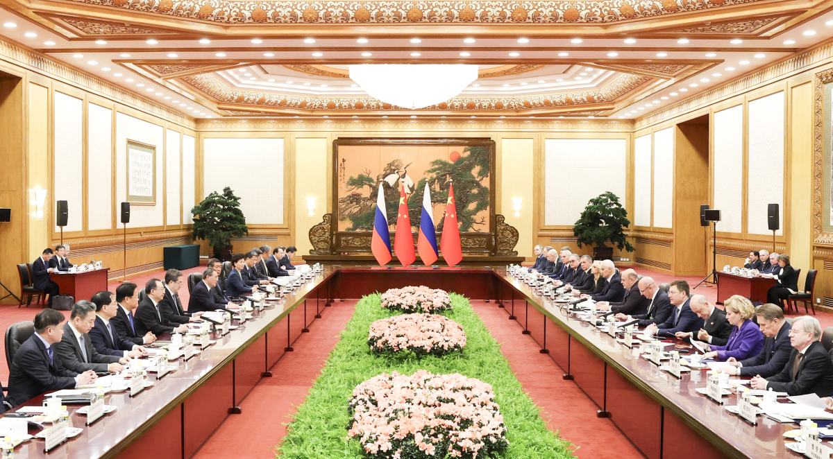李強表示,在習近平主席和普京總統的戰略引領下,中俄關係持續高水平運行,雙方政治互信更加牢固,民間友好不斷深化,務實合作更有韌性,國際協調更為密切,樹立了新型大國關係典範。中方願同俄方以明年兩國建交75周年為契機,落實好兩國元首重要共識,不斷傳承發揚中俄世代友好,推動中俄關係實現新的更大發展,持續增進兩國人民福祉,給世界注入更多穩定性和正能量。