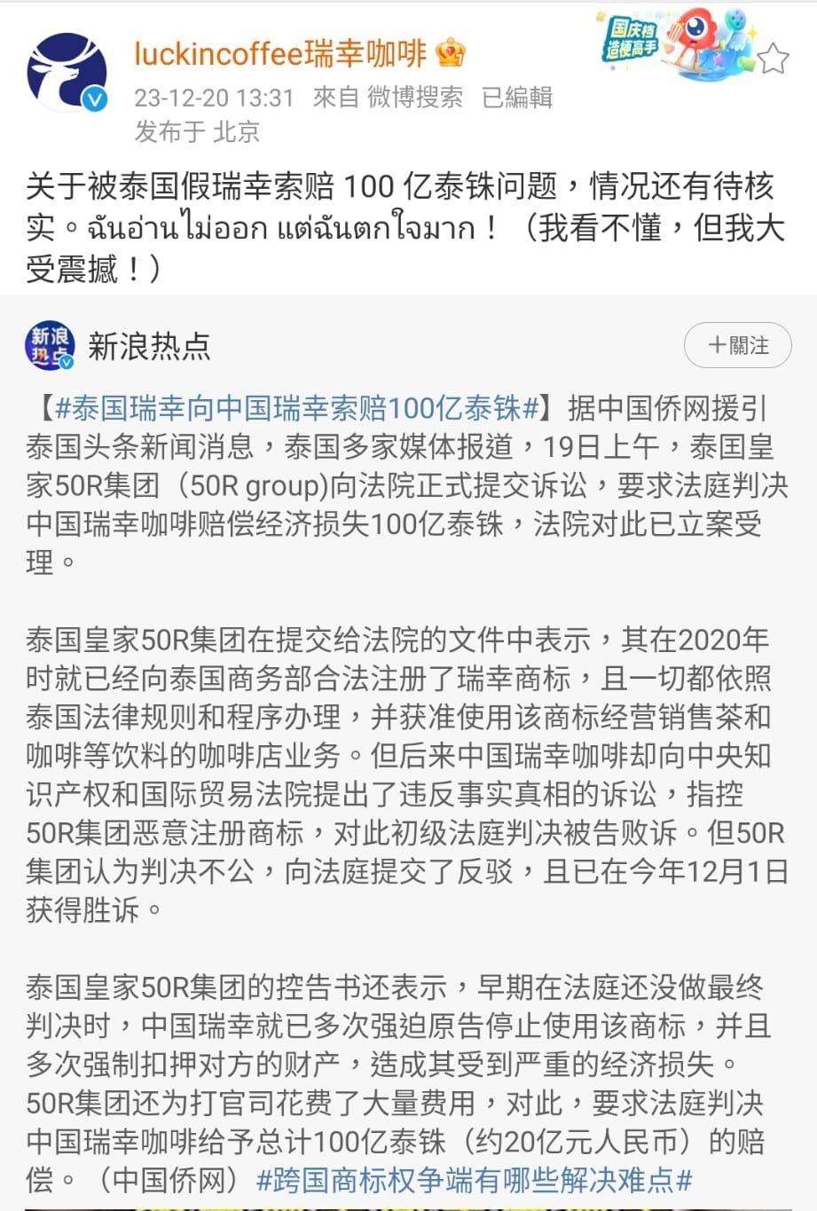 據泰國皇家50R集團在提交給法院的文件中表示,其在2020年時就已經向泰國商務部合法註冊了瑞幸商標,且一切都依照泰國法律規則和程序辦理,並獲准使用該商標經營銷售茶和咖啡等飲料的咖啡店業務。但後來中國瑞幸咖啡卻向中央知識產權和國際貿易法院提出了違反事實真相的訴訟,指控50R集團惡意註冊商標,對此初級法庭判決被告敗訴。但50R集團認為判決不公,向法庭提交了反駁,且已在今年12月1日獲得勝訴。