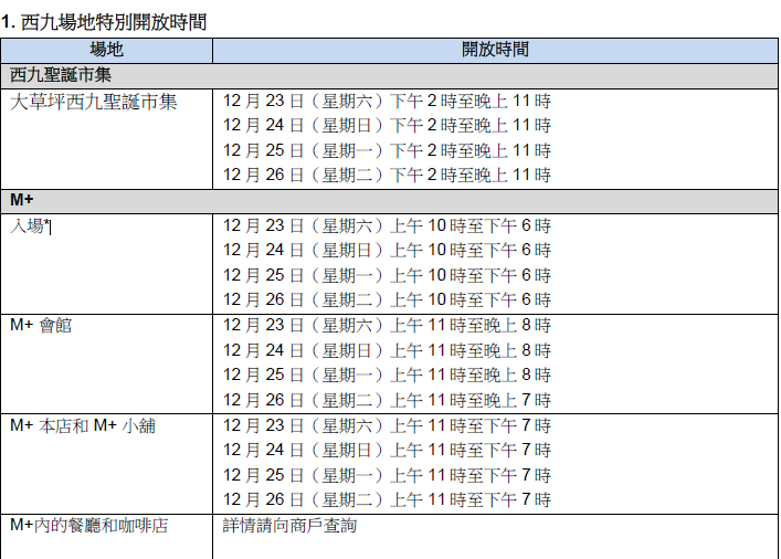 - M+將在12月25日(星期一)維持開放,開放時間為上午10時至下午6時。