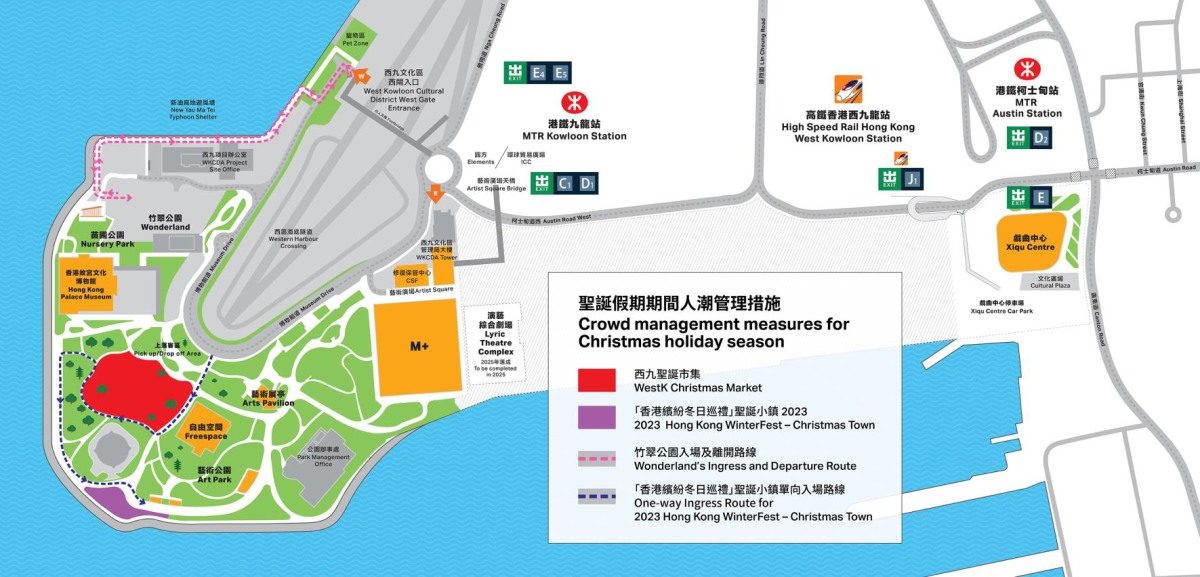 - 視乎實際情況,警方會在12月24日下午6時起封閉博物館道和文化道,西九亦會因應人潮在假期期間實施人潮管理措施。