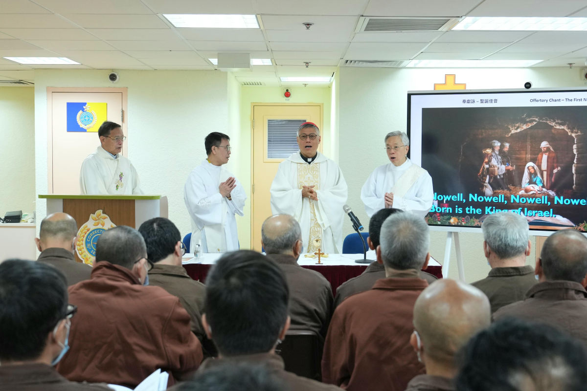 【點新聞報道】懲教署在聖誕節期間安排在囚人士參與聖誕節活動。天主教香港教區主教周守仁樞機今日(25日)在懲教署副署長(行動及策略發展)吳超覺、懲教署司鐸伍永鴻執事及懲教事務總監督梁頌賢陪同下,到赤柱監獄主持聖誕彌撒,為出席的在囚人士分享信仰哲理及送上聖誕祝福。他亦到訪監獄醫院探望患病的在囚人士,在節日中送上關懷與支持。