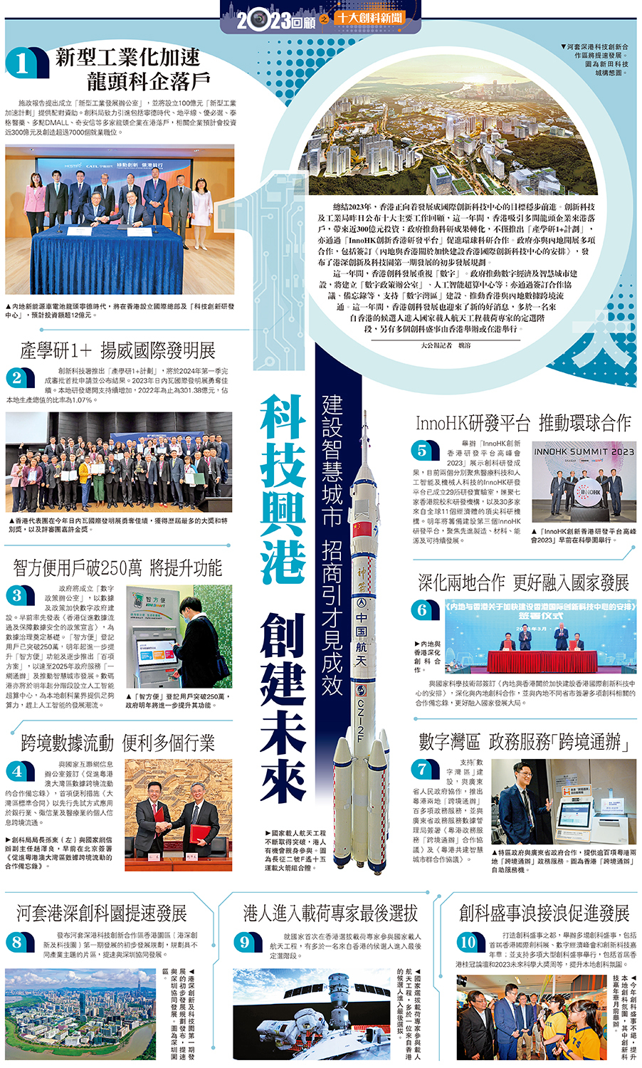 總結2023年,香港正向着發展成國際創新科技中心的目標穩步前進。創新科技及工業局昨日(30日)公布十大主要工作回顧,這一年間,香港吸引多間龍頭企業來港落戶,帶來近300億元投資;政府推動科研成果轉化,不僅推出「產學研1+計劃」,亦通過「InnoHK創新香港研發平台」促進環球科研合作。政府亦與內地開展多項合作,包括簽訂《內地與香港關於加快建設香港國際創新科技中心的安排》,發布了港深創新及科技園第一期發展的初步發展規劃。