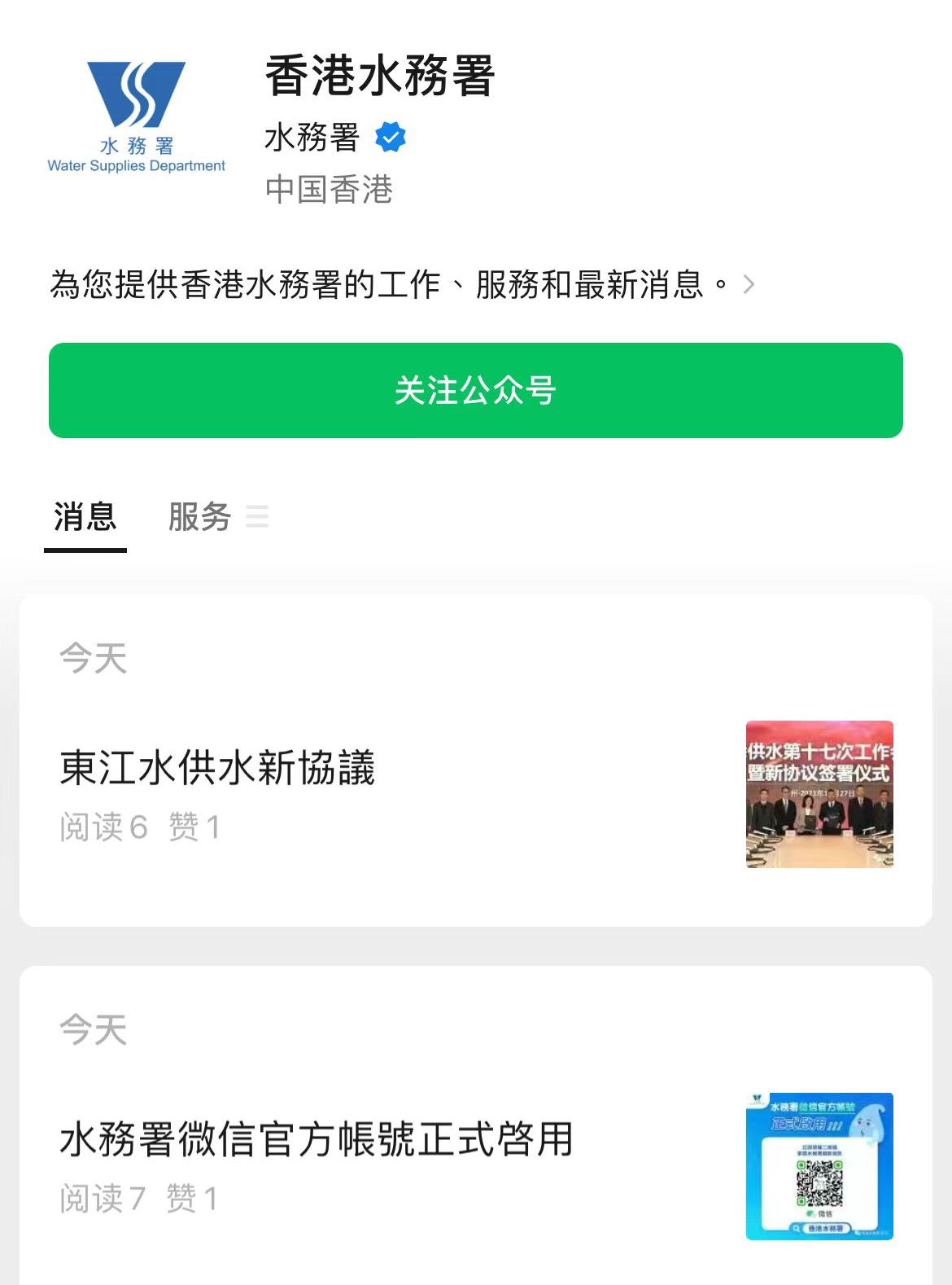 繼開設Facebook專頁、Instagram賬戶和YouTube頻道後,水務署開設微信官方賬號,透過此平台發布有關水務署多元化工作的最新資訊,推廣水務署專業形象,並讓公眾掌握更多有用的水務資訊,亦希望「香港水務署」的資訊更廣泛地讓香港、內地及其他地區民眾了解。