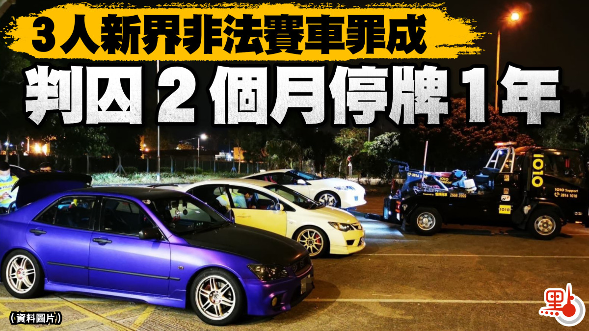 三人涉嫌在2022年12月在新界非法賽車,三人較早前分別承認危險駕駛罪,並就賽車罪及沒有第三者保險而使用車輛罪受審。裁判官馮念偉昨日在粉嶺裁判法院判三名被告分別入獄兩個月、罰款8,000元,停牌12個月並需修讀改進課程,危險駕駛罪存檔法庭。辯方申請擔保等候上訴獲批准,保釋條件為三萬元保釋金、不得離開香港、24小時內交旅遊證件、居住報稱地址、不准駕駛任何車輛及到警署報到。