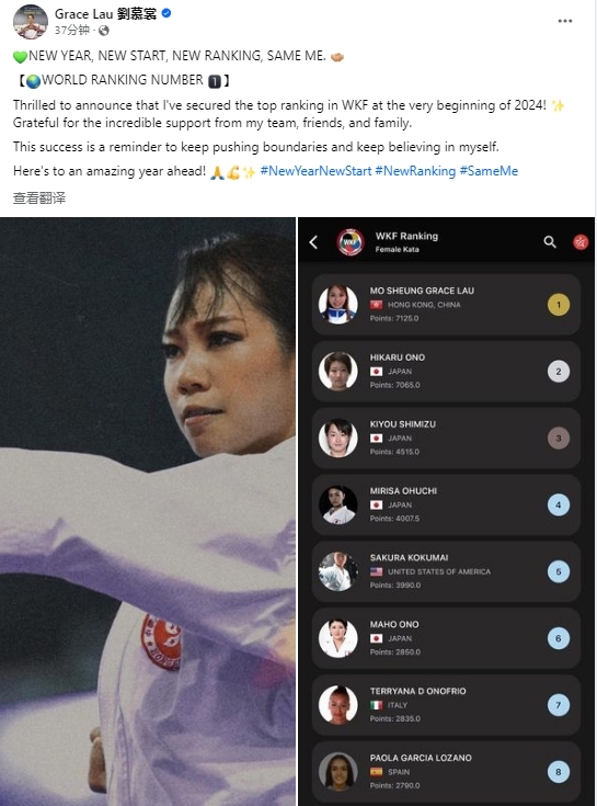 【點新聞報道】世界空手道聯會公布最新世界排名,港隊空手道代表劉慕裳在女子個人形項目中以7125分升至世界排名第一,為本港首位登上「世一」寶座的空手道運動員。