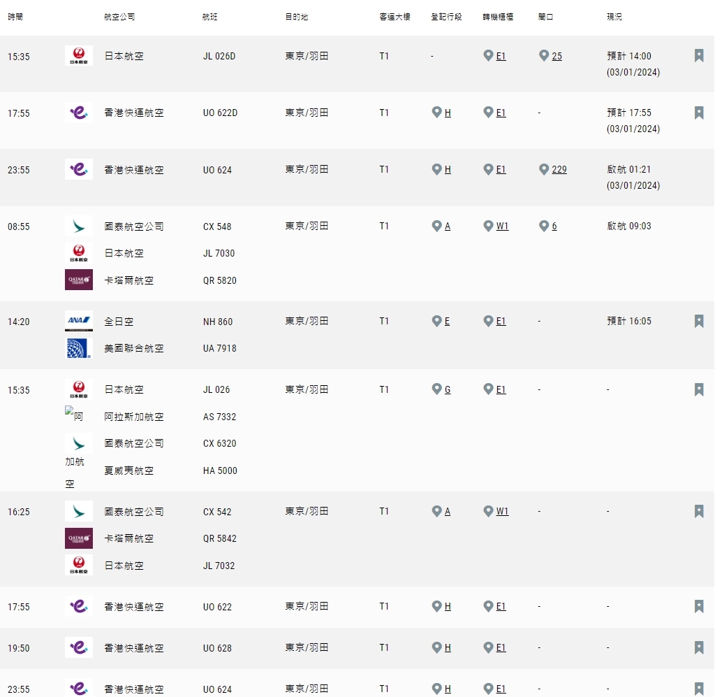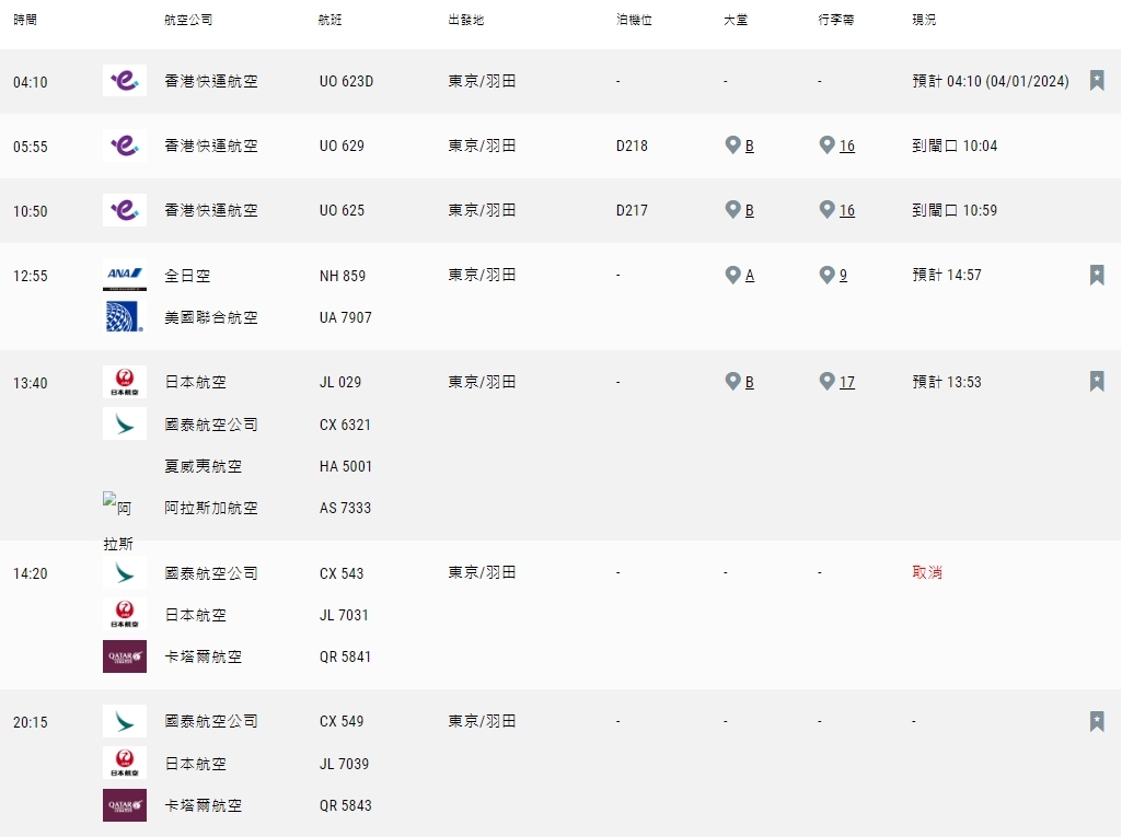 今日亦有7班航機計劃從羽田機場抵港,其中一班原定下午2時20分出發的航班取消,由國泰、日航及卡塔爾航空聯運;一班香港快運的航班要延至明日(4日)出發返港。