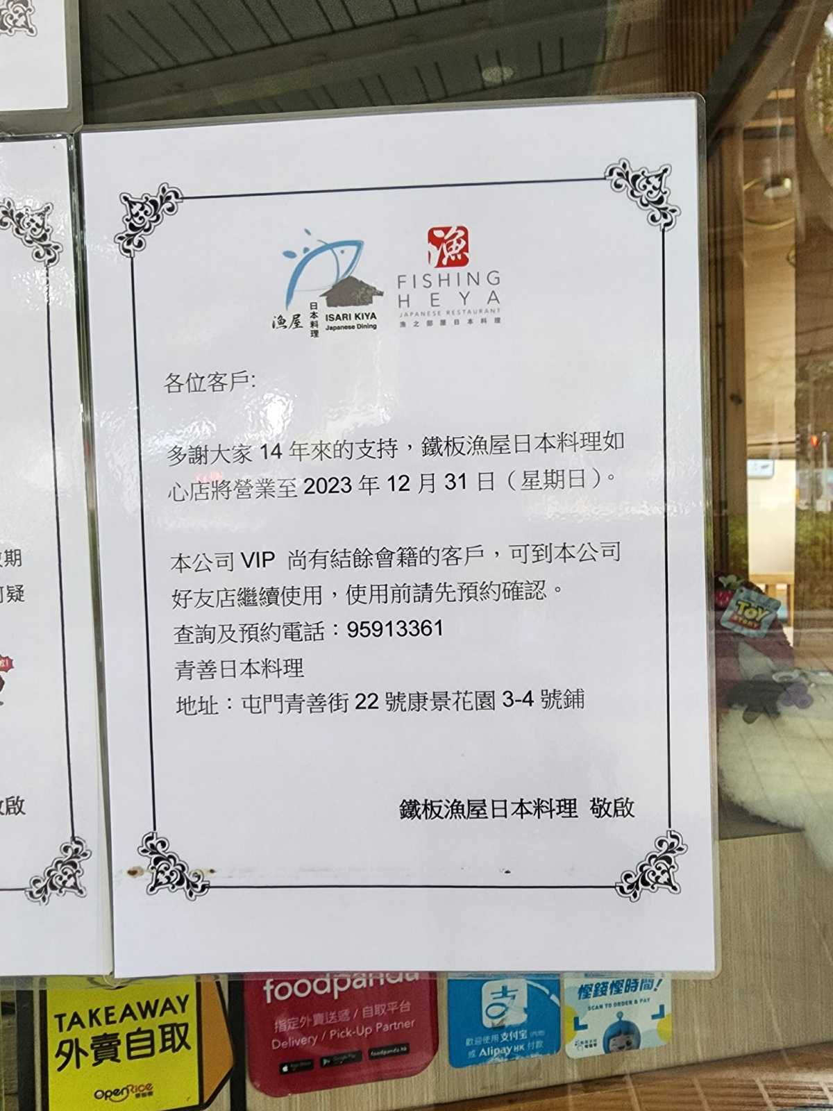 開業最少14年的鐵板漁屋日本料理一度有4間分店,早前大埔及將軍澳店已結業,荃新天地及如心廣場店亦於去年底結業。公司於店門口張貼告示,指已購買會籍的顧客可以到其位於屯門的好友店繼續使用,並須事先致電該店預約確認。不過有網民指,曾致電該店卻一直轉駁至留言信箱。