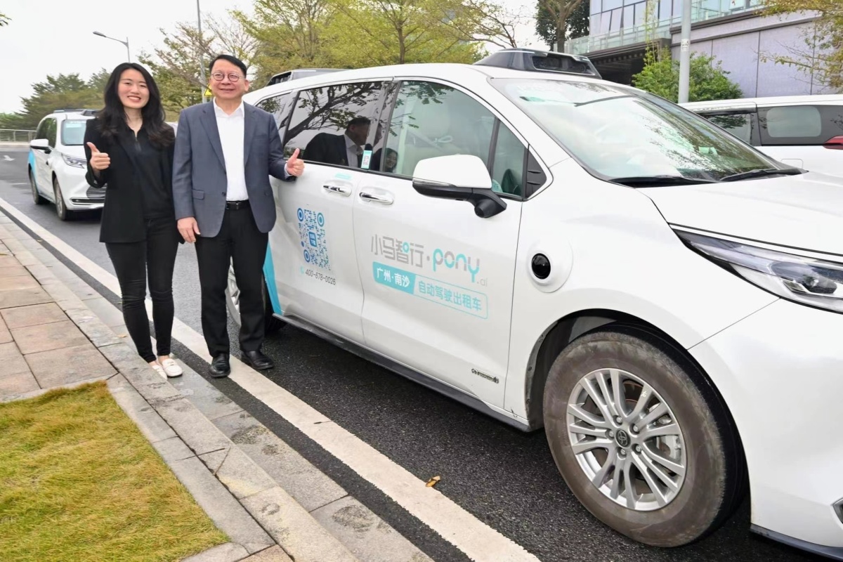 大灣區三城訪問第二天,陳國基於廣州市體驗南沙創新與人才共融發展。在廣州南沙參觀自動駕駛初創企業小馬智行,又試坐他們的無人駕駛出租車後,陳國基表示「全程順暢安全」。