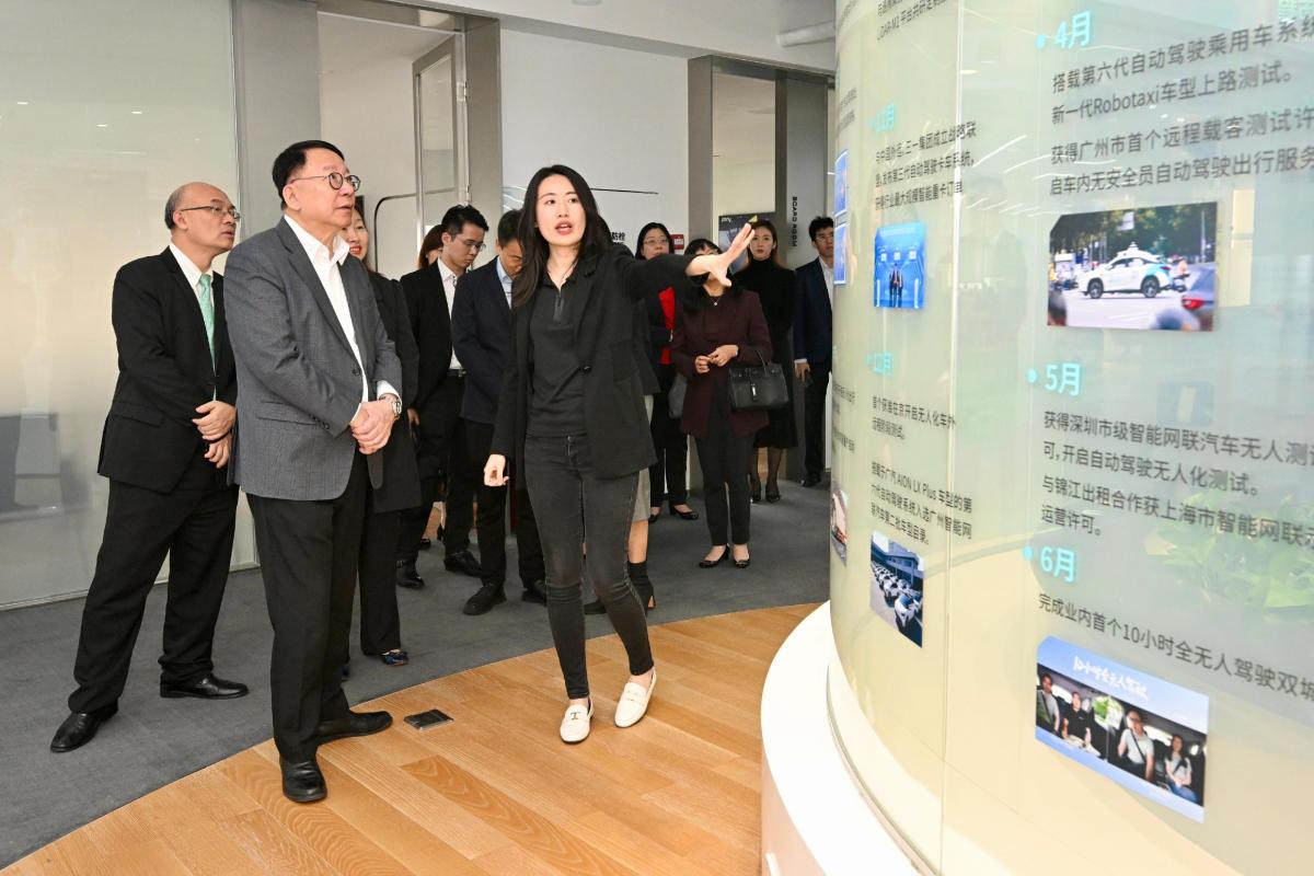 陳國基早上在廣州南沙參觀自動駕駛初創企業小馬智行,並試乘其自動駕駛出租車。他欣悉企業着力研發先進、安全和可靠的自動駕駛技術,在內地不同城市均有進行道路測試,並正推展商業化營運。