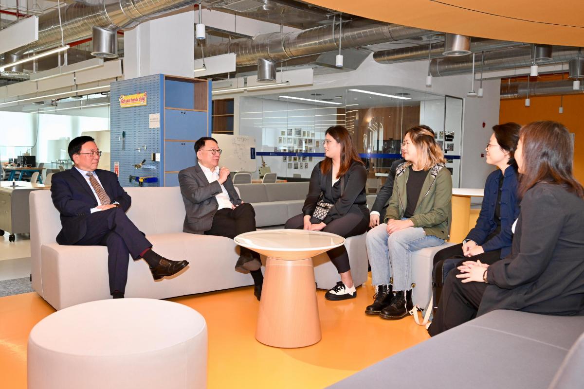 陳國基接着到位於南沙的香港科技大學(廣州)(港科大(廣州))參觀,與校長倪明選教授、科研人員和來自香港的學生交流,了解校方在教研、科技成果轉化和學生交流等各方面的進展。港科大(廣州)2022年9月開校,是《粵港澳大灣區發展規劃綱要》頒布以來首個獲國家教育部批准正式設立的內地與香港高校合作辦學項目。