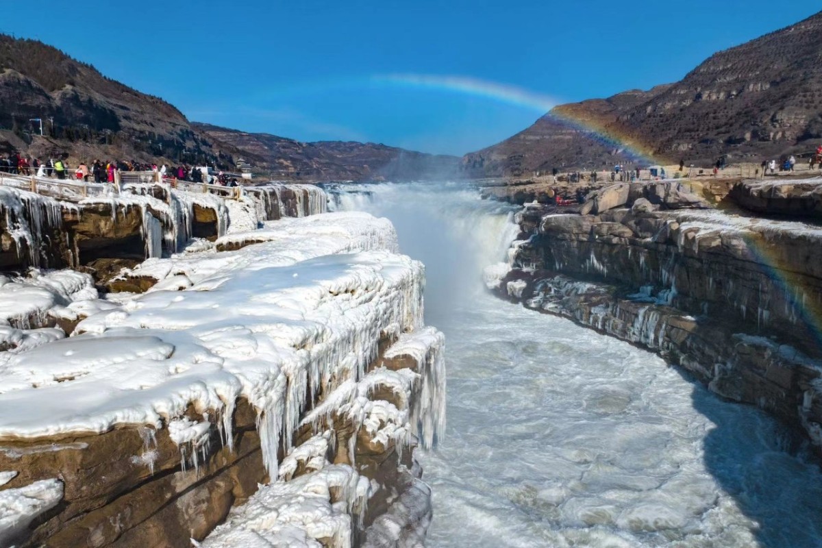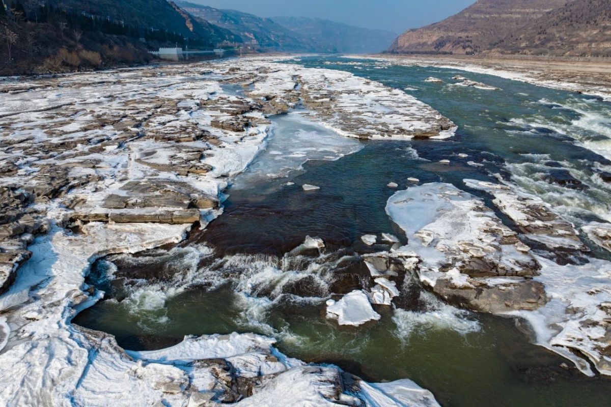 據了解,壺口瀑布被譽為「黃河之心,民族之魂」,是中華民族精神的象徵,彰顯母親河的波瀾壯闊、大自然的鬼斧神工。今年元旦前後,隨着天氣的變化,黃河壺口瀑布河段出現碧綠色的河水。微風輕輕吹過,水霧隨風搖曳,濺起的水花在寒風的吹拂下瞬間凝結,飄落在瀑布岸邊,化為一片晶瑩剔透的冰層,彷彿是大自然精心繪製的畫卷。而更多晶瑩剔透的冰掛則垂在河兩岸,折射溫暖的冬日陽光,瀑布、冰掛、碧水相互交織,讓人不禁驚嘆大自然的神奇和美麗。