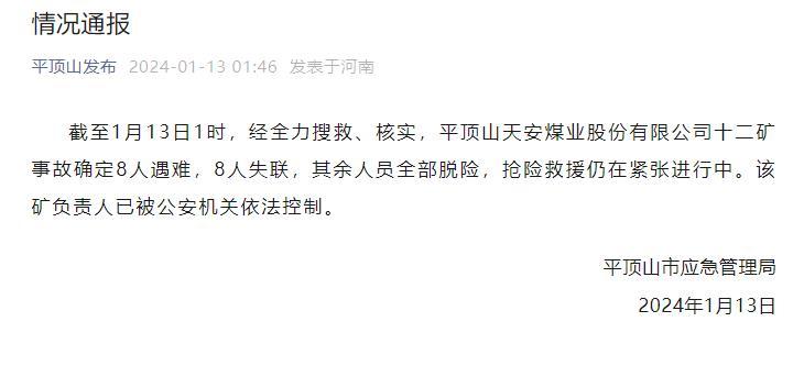 據「平頂山發布」公眾號消息,昨日(12日)下午近3時,河南省平頂山天安煤業股份有限公司十二礦發生一起煤與瓦斯突出事故。當班入井425人,截至今日(13日)凌晨1時,經全力搜救、核實,事故確定8人遇難,8人失聯,其餘人員全部脫險,搶險救援仍在緊張進行中。該礦負責人已被公安機關依法控制。