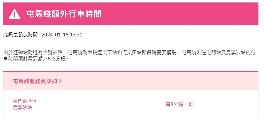 港鐵下午6時27分公布,由於紅磡站附近有信號故障,屯馬綫列車駛經尖東站和何文田站路段時需要慢駛,屯馬綫來往屯門站及烏溪沙站的行車時間預計需要額外10至15分鐘。