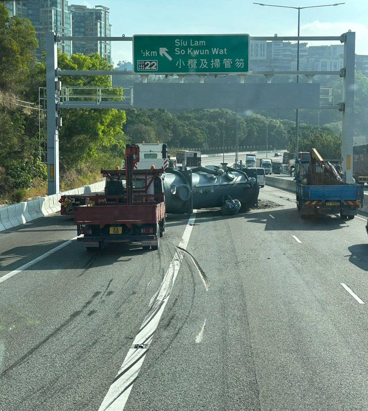現場消息指,事發地近小欖出口,路面壓毀面積約3米乘5米,周圍可見剎車線清晰。僅有部分行車線可供通行,附近交通擠塞,龍尾一度延至屯門醫院。事發至中午,現場仍未完成清理。