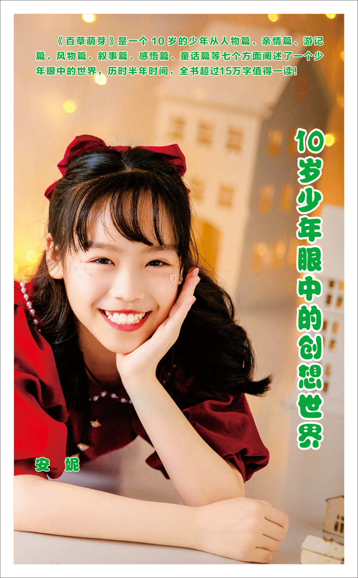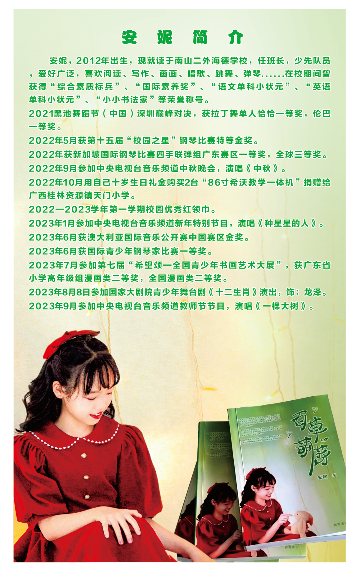 據了解,《百草萌芽》作者安妮,2012年出生,現就讀於南山二外海德學校,任班長,少先隊員,愛好廣泛,喜歡閱讀、寫作、畫畫、唱歌、跳舞、彈琴......在校期間曾獲得「綜合素質標兵」、「國際素養獎」、「語文單科小狀元」、「英語單科小狀元」、「小小書法家」等榮譽稱號。