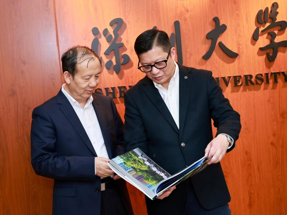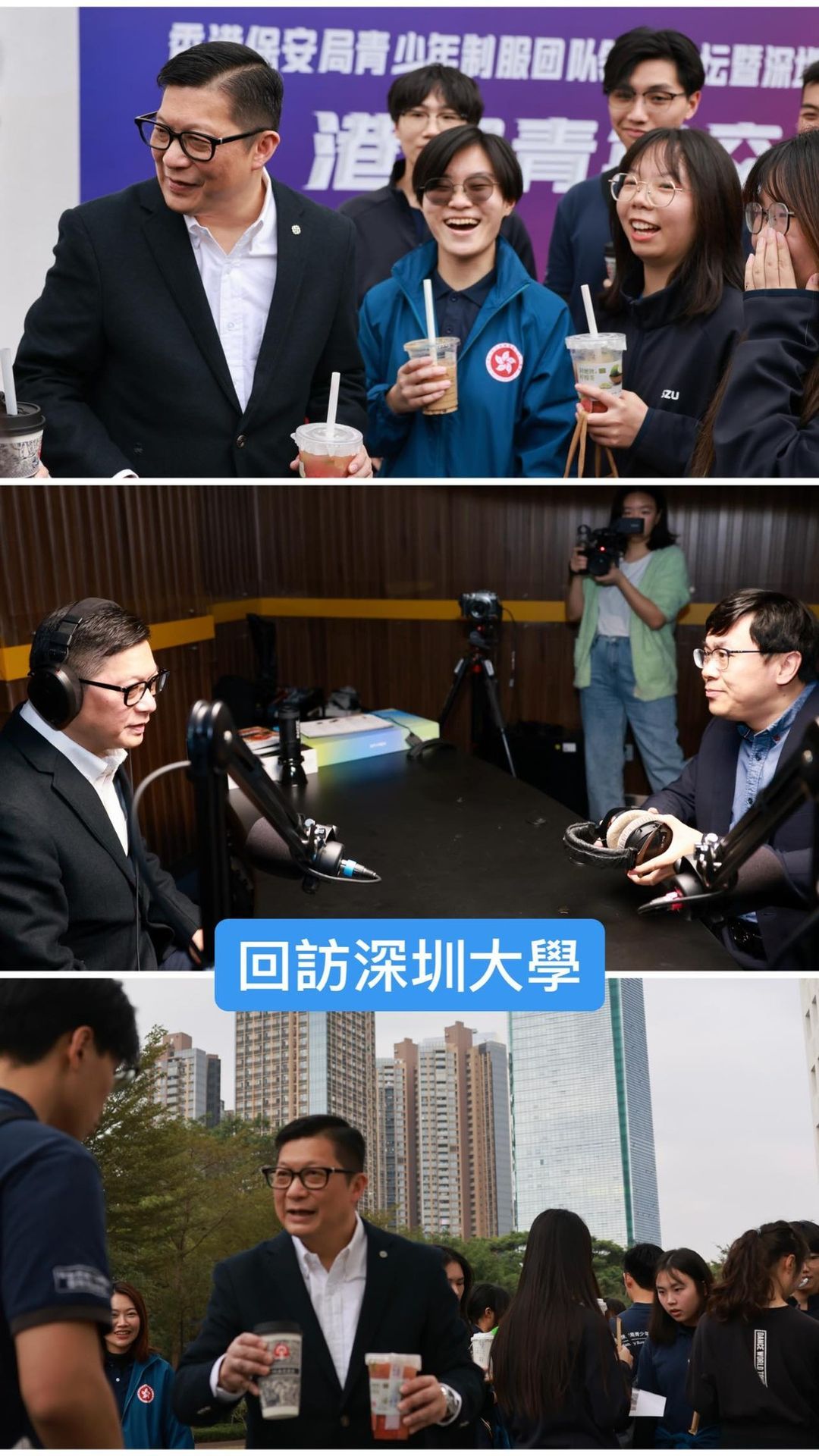 【點新聞報道】保安局局長鄧炳強去年5月與深圳大學校長毛軍發首次見面,其後促成了保安局及深大就「保安局青少年制服團隊領袖論壇」的合作。鄧炳強今日(21日)在社交平台發文指,在香港舉辦連串活動後,今日再率青年領袖論壇成員回訪深圳,除了參觀多間科企和文明實踐站,亦再次到訪深大與毛校長座談,交流活動想法。