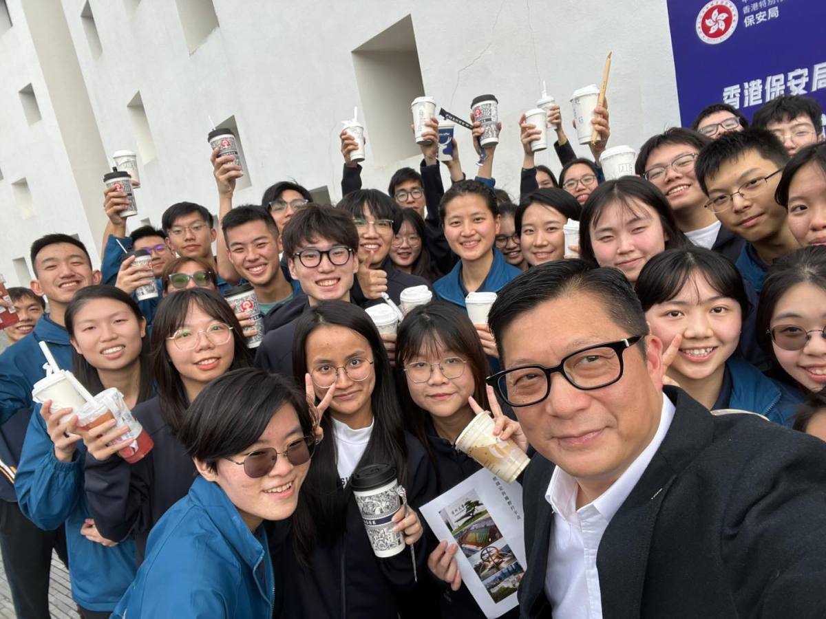 鄧炳強又說,今日亦參觀了校園的傳播實驗室和土木實驗室,期間還融入當地潮流,請所有師生一齊品嘗內地網紅茶飲,感受地道風味。圖片所見,鄧炳強為大家買了多個不同品牌的網紅茶飲,包括不少港人北上遊玩必飲的「霸王茶姬」、「瑞幸」和「阿嬤手作」,他自己亦品嘗了一杯「阿嬤手作」的土芭樂檸茶。