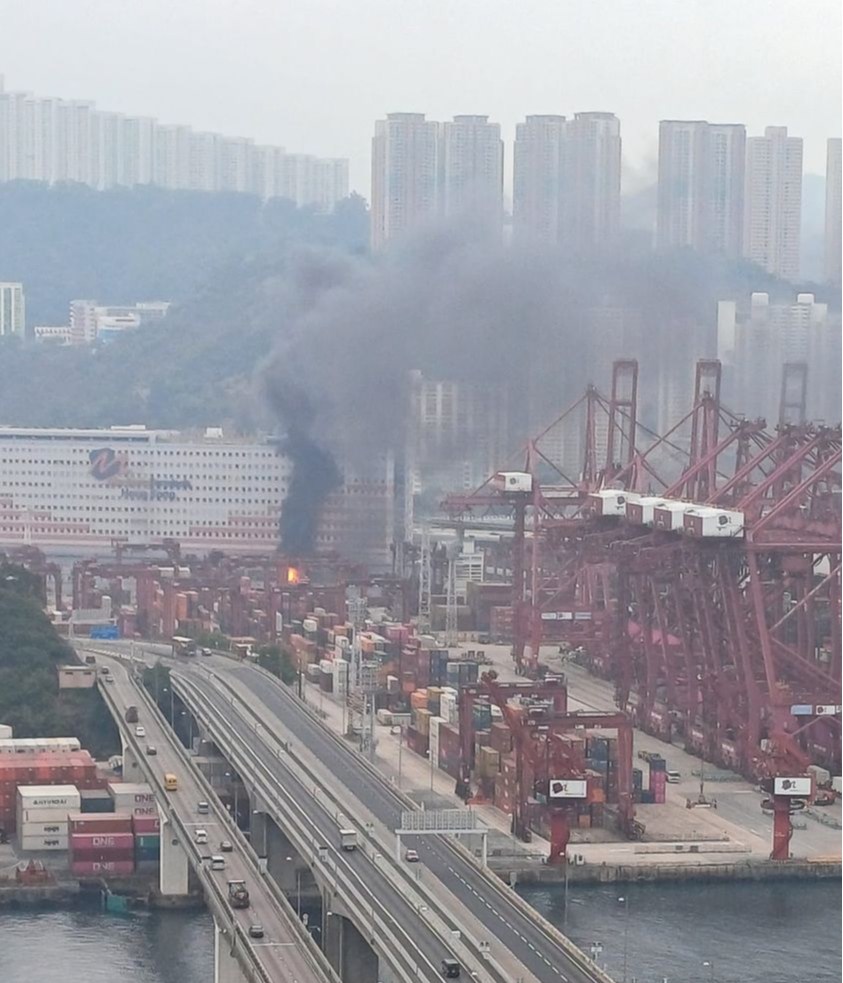 【點新聞報道】今日(22日)上午11時許,警方接到多人報案,指葵涌一號貨櫃碼頭有貨物起火,火勢一度猛烈,濃煙席捲半空。消防接報到場開喉撲救,碼頭內近百名工人需疏散到安全位置,火警約半小時後被救熄。