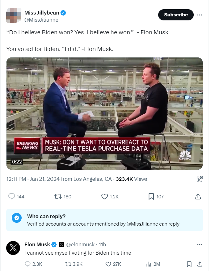 據俄新社報道,一個名為「MissJilianne」的X賬號21日分享了一段馬斯克2023年5月接受美國消費者新聞與商業頻道(CNBC)採訪的視頻。CNBC主持人在採訪中提到2020年美國總統選舉,並稱馬斯克當時把票投給了拜登。馬斯克承認了這一點:「我是這麼做的。」在這篇帖子的評論區,馬斯克寫道,「我無法想像自己這次把票投給拜登」。