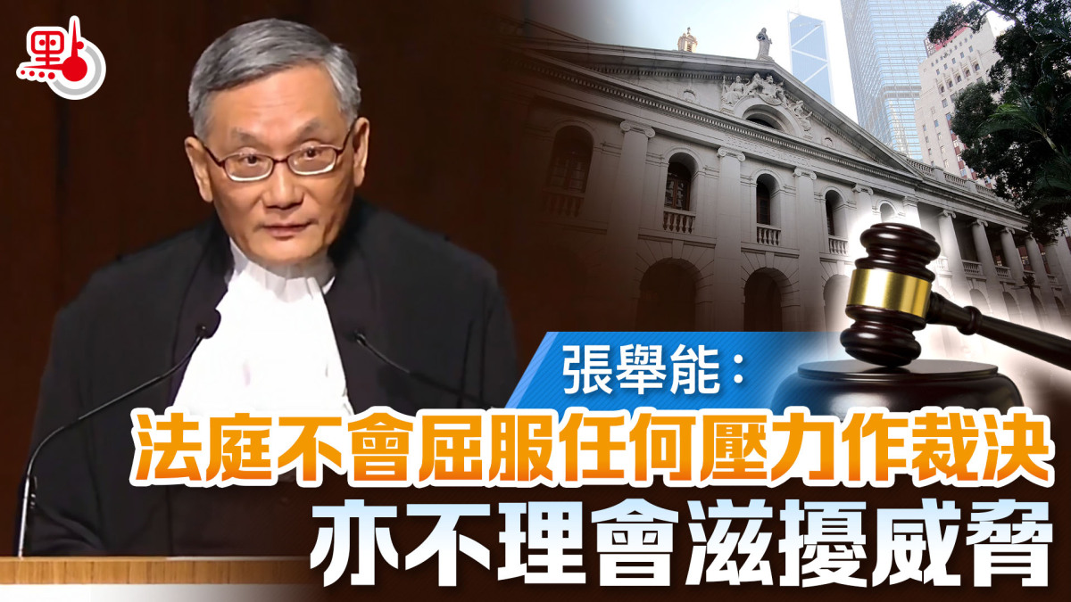 張舉能又說,過去數年,司法機構的工作時常被人「透過國安法的棱鏡審視」。以這種眼光看待司法工作,乃至香港的法治及司法獨立的現狀,必然產生非常狹隘,甚至失實的看法。但無論別人對香港的法律制度提出怎樣的說法或評論,法院及法官都將繼續履行憲制責任,以無懼、無偏、無私、無欺的精神,公正有效地主持正義。