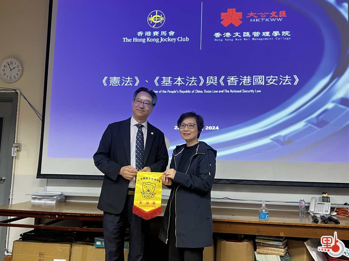 活動伊始,仁濟醫院王華湘中學校長邱少雄向香港賽馬會和香港文匯管理學院執行院長劉慧華頒授錦旗。隨後,王俊傑從何謂憲法、憲法與基本法的關係、基本法與生活的關係、中央為香港制定香港國安法的原因,以及其他國家如何維護國家安全等方面展開講解。